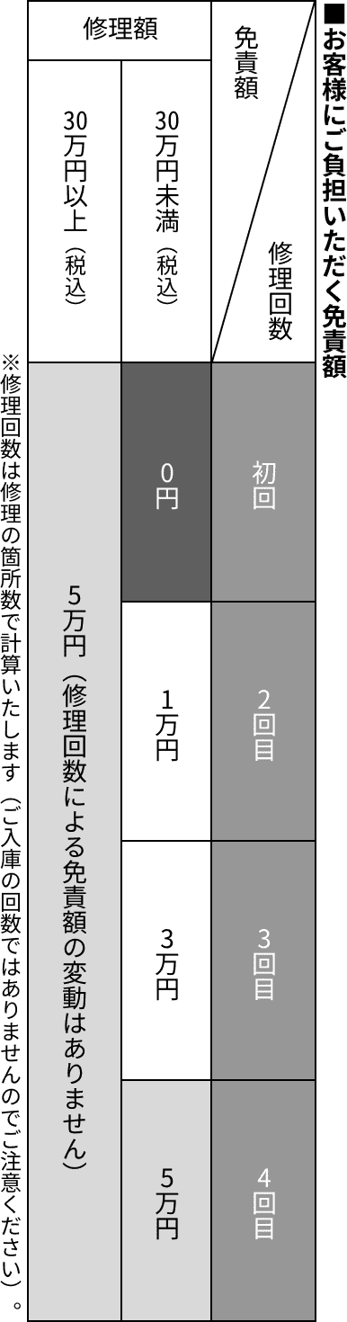 保証期間中の修理限度額、修理回数は無制限です。ただし、保証修理を受ける場合、以下の条件に基づいて免責金額をご負担いただきます。