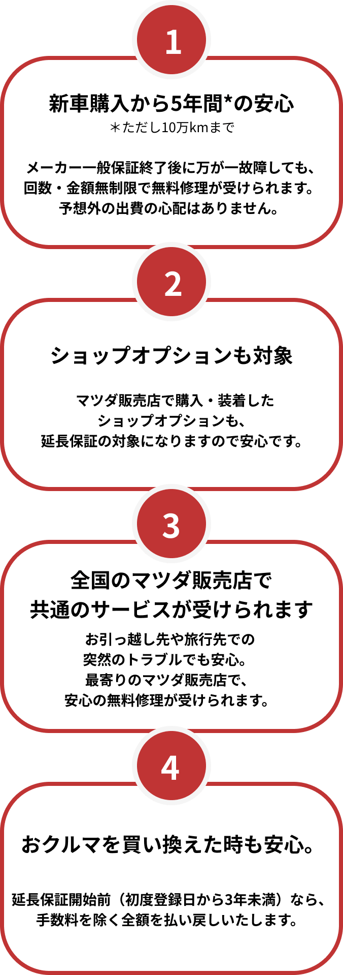 • マツダ延長保証〈新車5年プラン/5年プラン〉による延長保証は、マツダ株式会社が指定するサービス工場での初回車検実施がご加入および延長保証適用の条件となります。