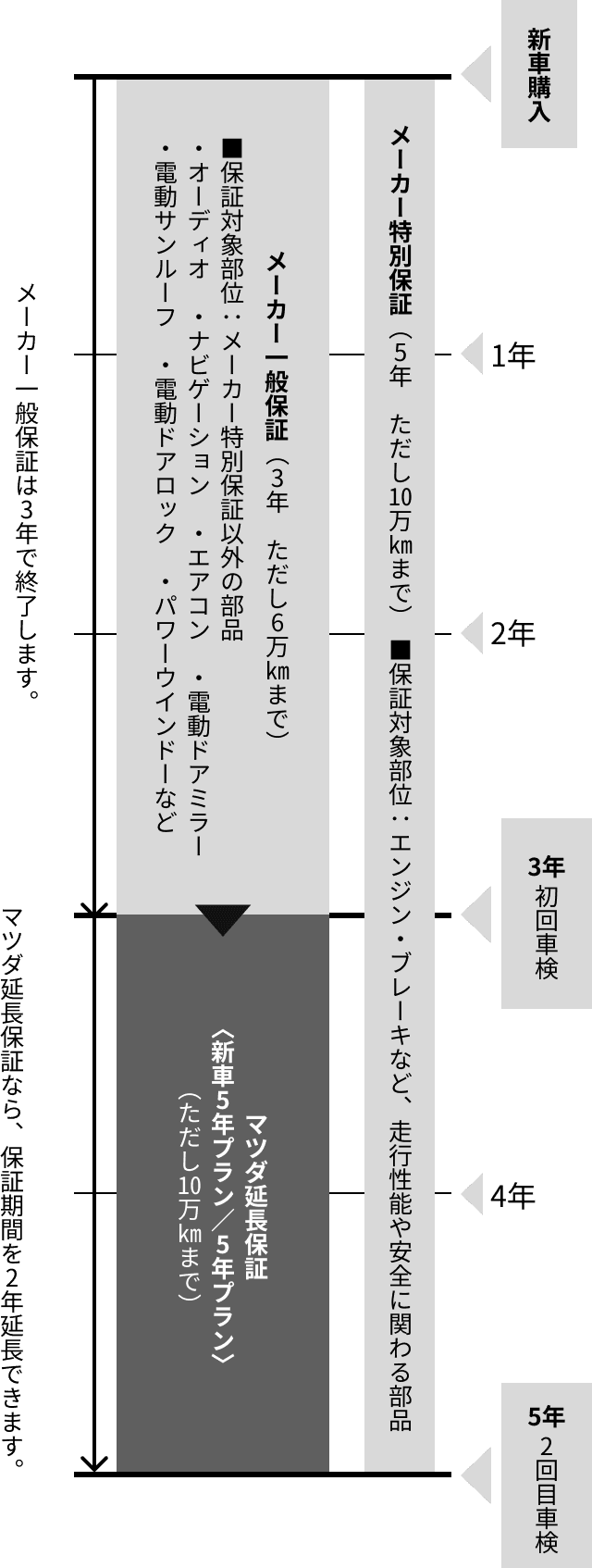 *走行性能や安全に関わるエンジンやブレーキなどの部品は、5年目(ただし10万km)までメーカーが保証します(メーカー特別保証)。